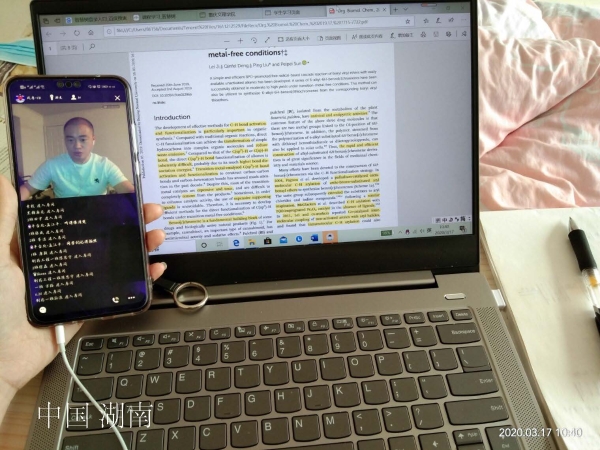 3月17日上午,按照2019级制药工程专业《有机化学》教学内容安排,由公司正在美国阿肯色大学从事博士后科研工作的方波博士为同学们讲解与《有机化学》第二章内容相关英文文献,进行课后知识“加餐”。“大家好,这里是美国当地时间晚上21:50,今天我们一起学习《Organic & Biomolecular Chemistry》上最新发布的研究论文BPO-promoted direct oxidative C–H functionalization of unactivated alkanes into 6-alkyl-6H-benzo[c]chromenes under transition-metal-free conditions,……”。在QQ群课堂直播中,同学们认真听取了方波博士对文献的详细讲解,不断互动,积极提问,并做了详细的笔记。同学们还就美国阿肯色大学校园学习生活等相关问题进行了咨询。