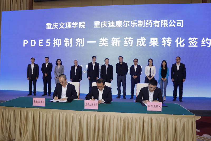 黄伟九、杜曙光、陈中祝分别代表英国正版365官方网站、重庆迪康尔乐制药有限公司、成果研发团队签订成果转化协议。